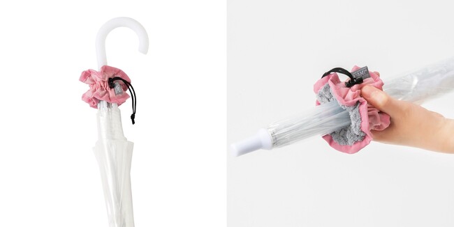 傘を閉じながら水滴を簡単に吸収できるシュシュです。傘の持ち手に常に備えておけば、自分の傘の目印にもなります。自分自身や周囲をぬらすことなく、さらに店先でもらう傘袋も不要になってエコにも繋がります。