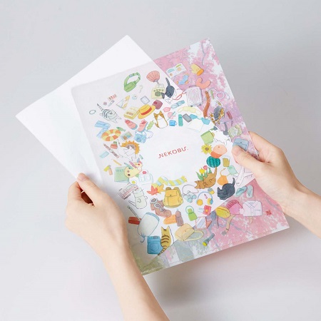 ファイル裏面には、旅の道具に猫たちが囲まれるカラフルでにぎやかなイラストがデザインされています。(12デザイン共通)イラスト部分以外はクリアになっているので、中に入っている書類が確認しやすいのも便利です。