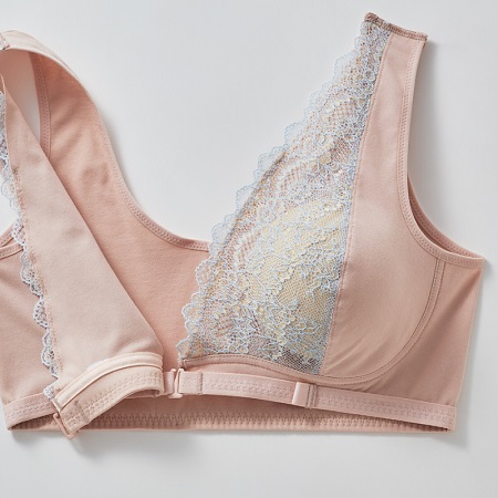 バストに関してさまざまな悩みを持つ誰もが、気持ちよく楽しめるようにと誕生したノンワイヤーブラです。2か所を留めるフロントクロスオープン仕様で着脱しやすく、肩への負担が軽いのが特徴です。肌側は滑らかな肌当たりの綿スムース素材で、気になるパーツはできるかぎり外側に付けるなど、着け心地のよさとフィット感を実現しています。機能面に加えて、気分の上がる華やかなデザインも魅力です。胸もとのレース遣いが華やかな印象の〈ブルーレース〉〈ピンクレース〉〈ホワイトレース〉の3種類のデザインです。