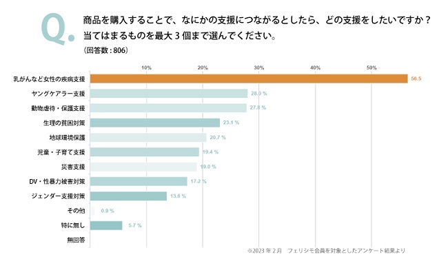 フェリシモ会員さまのうち、インナー購入者を対象としたアンケートでは「商品を購入することで、なにかの支援につながるとしたら、どの支援をしたいですか?」という質問に対して、「乳がんなど女性の疾病支援」と答えた方が56.5%と最多の票が集まりました。