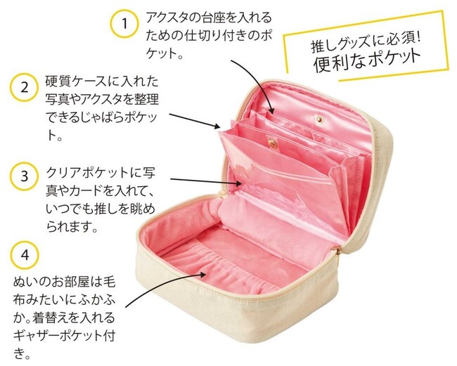 まさか「ぬい」や推し活グッズが詰め込まれているとは想像できない一見バニティーポーチのようなデザインに仕立てられています。ネップの入ったナチュラルな帆布生地に、合皮のパイピングとロゴ刺しゅう推し色がワンポイントです。