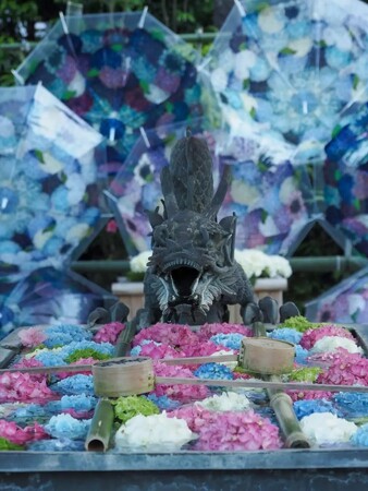 柳谷観音 楊谷寺からのメッセージ:昨年好評をいただきました“花手水”や境内を「紫陽花傘」が今年も彩ります。花手水発祥の地としての当山は、新たな文化として根付くことを目指しています。癒しの観音さま、そして花々が皆さまをお待ちしております。