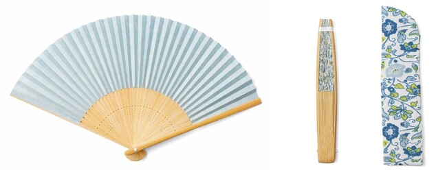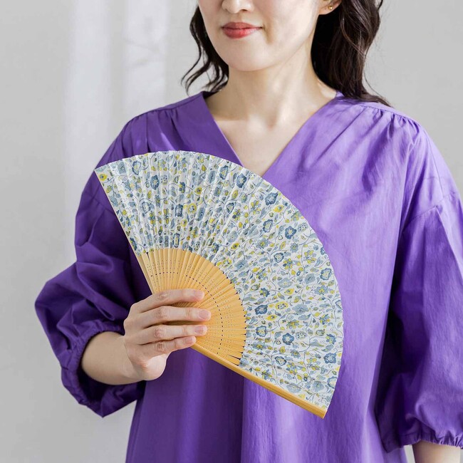 扇面は国産和紙を使用しています。表は涼やかな色を基調とした宝相華文様で、裏はふだんの装いにも合わせやすい上品な薄浅葱色です。両面貼りなので、片面貼りに比べて耐久性があり、しっかりしているので布扇子より風量が増す特徴があります。扇子と同柄の扇子袋付きなので扇子が傷みにくく、バッグに入れて持ち歩くときに便利でうれしいポイントです。