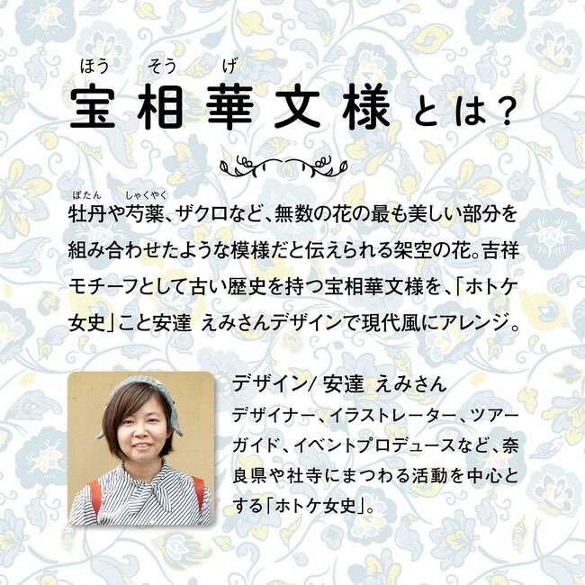 牡丹や芍薬、ザクロなど、無数の花の最も美しい部分を組み合わせたような模様だと伝えられる架空の花です。吉祥モチーフとして古い歴史を持つ宝相華文様を、「ホトケ女史」こと安達 えみさんによるデザインで現代風にアレンジしています。