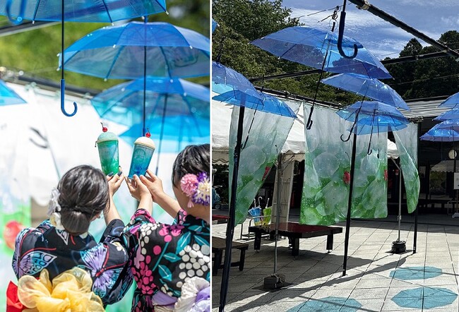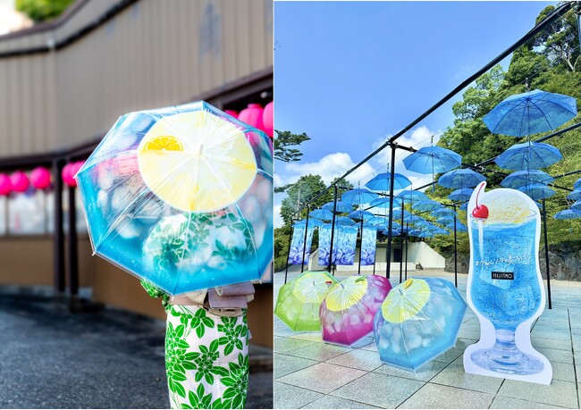 法多山尊永寺境内の「だんご茶屋」前に展示された青いアンブレラスカイとともに、フェリシモの「クリームソーダに浸る カーテンマルチクロス」の展示および巨大クリームソーダパネルが設置されます。また「クリームソーダ傘〈ブルークリームソーダ〉〈ピンククリームソーダ〉〈メロンソーダ〉」の無料貸し出しを実施します。「着付のわかぎ」では「クリームソーダ傘」および「クリームソーダポーチ」の無料貸し出しを行っています。