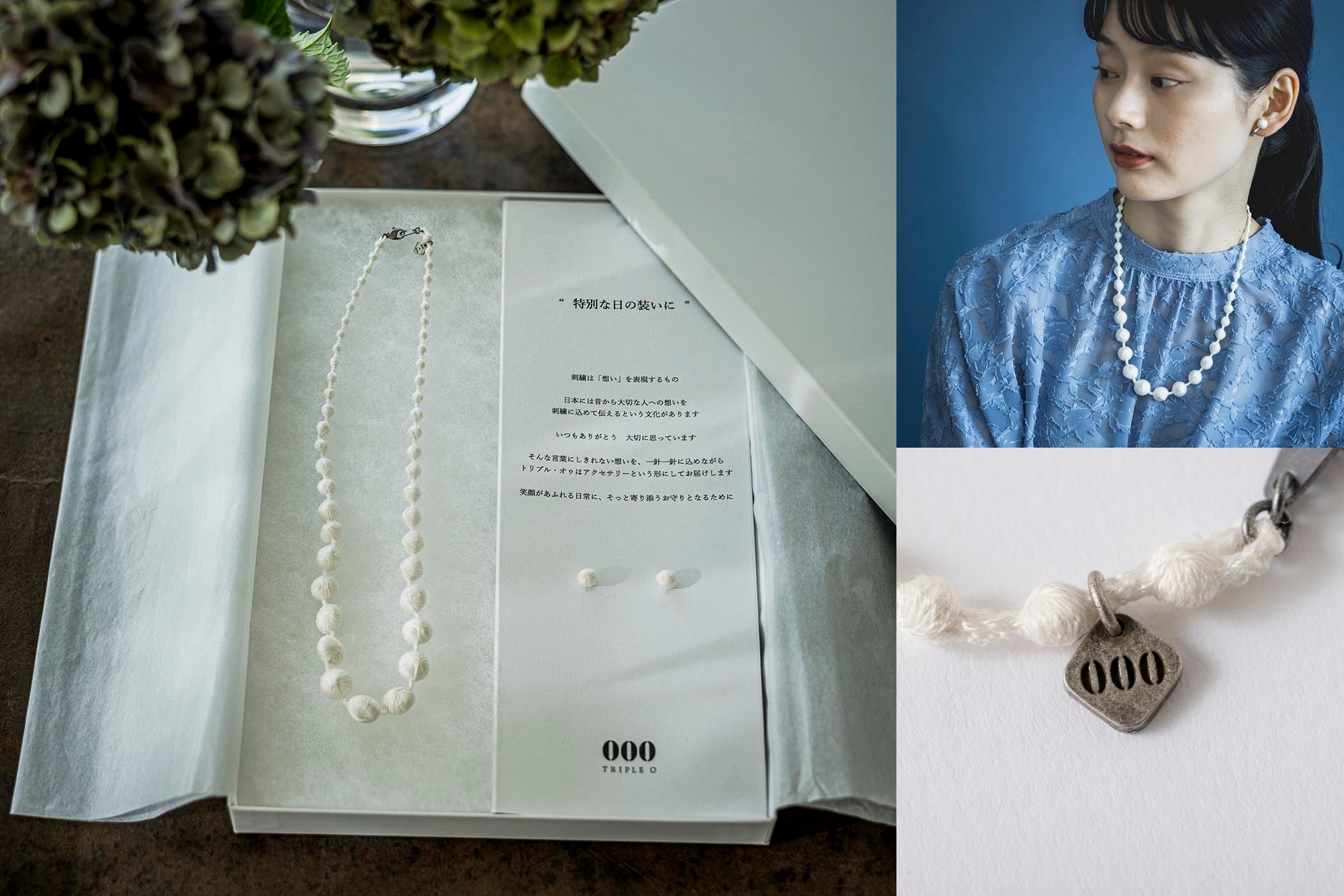 「20周年を記念して、未来に喜びや楽しみをつないでいけるものを」と取り寄せさせていただいたのが、ネックレスと耳飾りの保管箱セット。群馬県桐生市にある老舗の刺繍メーカー「笠盛」が展開するブランド〈000/トリプル・オゥ〉のオリジナルアイテムです。いつかのために手元に迎えるのはもちろん、大切な人のしあわせを願うギフトにも。着ける日が待ち遠しく、着けるたびに素敵な思い出が刻まれていく、特別な逸品です。