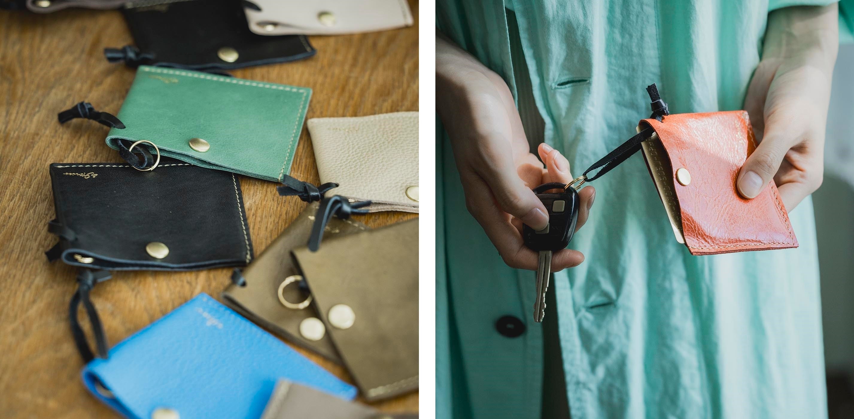 マチのないスリムなフォルムは、カード類の収納にぴったり。金色のスナップボタンは中身が飛び出すのを防ぐとともに、デザインのアクセントにもなっています。レザーストラップには丸カンが付いているので、自宅や車の鍵などを入れるキーケースとしても活躍します。シンプルなデザインですが、革の色や厚み、風合いなどによって、まったく印象が違うのが特徴です。なんと金色の箔押しはすべて、岡さん自ら捺して仕上げてくださいます。さまざまなバッグやお財布の片鱗が、新たなカタチになって皆さんのもとへ。まさに、「20年分のLittle Promise」を象徴するアイテムです。何色のどんな革が届くかは、どうぞお楽しみに!