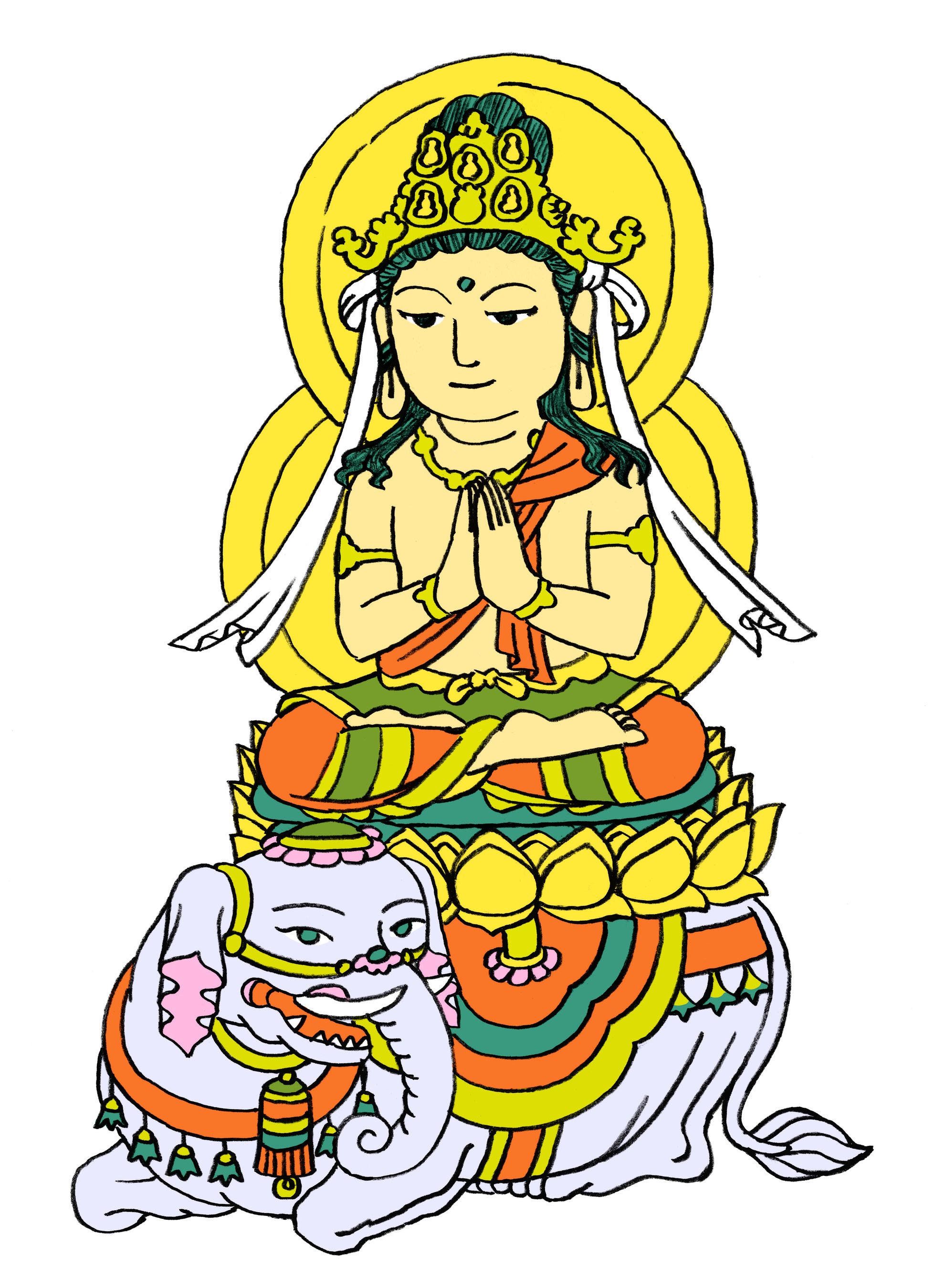 仏教には「十三仏信仰」と「守り本尊」という考え方があります。そこでは初七日から三十三回忌までの13回の追善供養の際に、亡くなった人を浄土に導く仏さまを「十三仏」として伝え、古くから信仰を集めていました。そのうち八尊は十二支の守護仏「守り本尊」として伝わり、私たちに降りかかる災厄から守ってくれるといいます。辰年と巳年をつかさどる普賢菩薩さまは、法華経を守る仏さまでもあり、合掌して白象に乗るお姿で表されます。