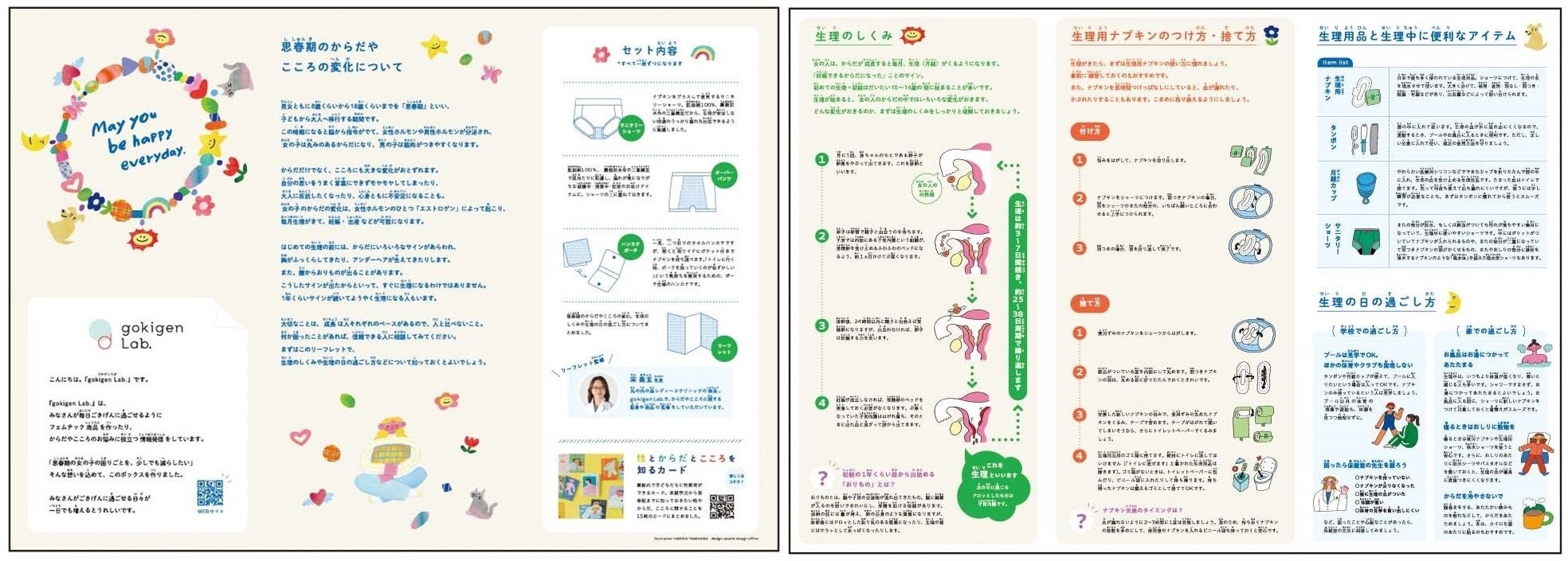 同封されているリーフレットは、産婦人科専門医の宋美玄先生から、からだやこころの変化が訪れはじめた思春期の女の子たちへのメッセージ。生理を正しく伝えられます。リーフレットの裏側では生理のしくみはもちろん、必要な生理用品や、ナプキンのつけ方や捨て方も解説。不安なく初潮を迎えられるよう、わかりやすくていねいに仕上げました。