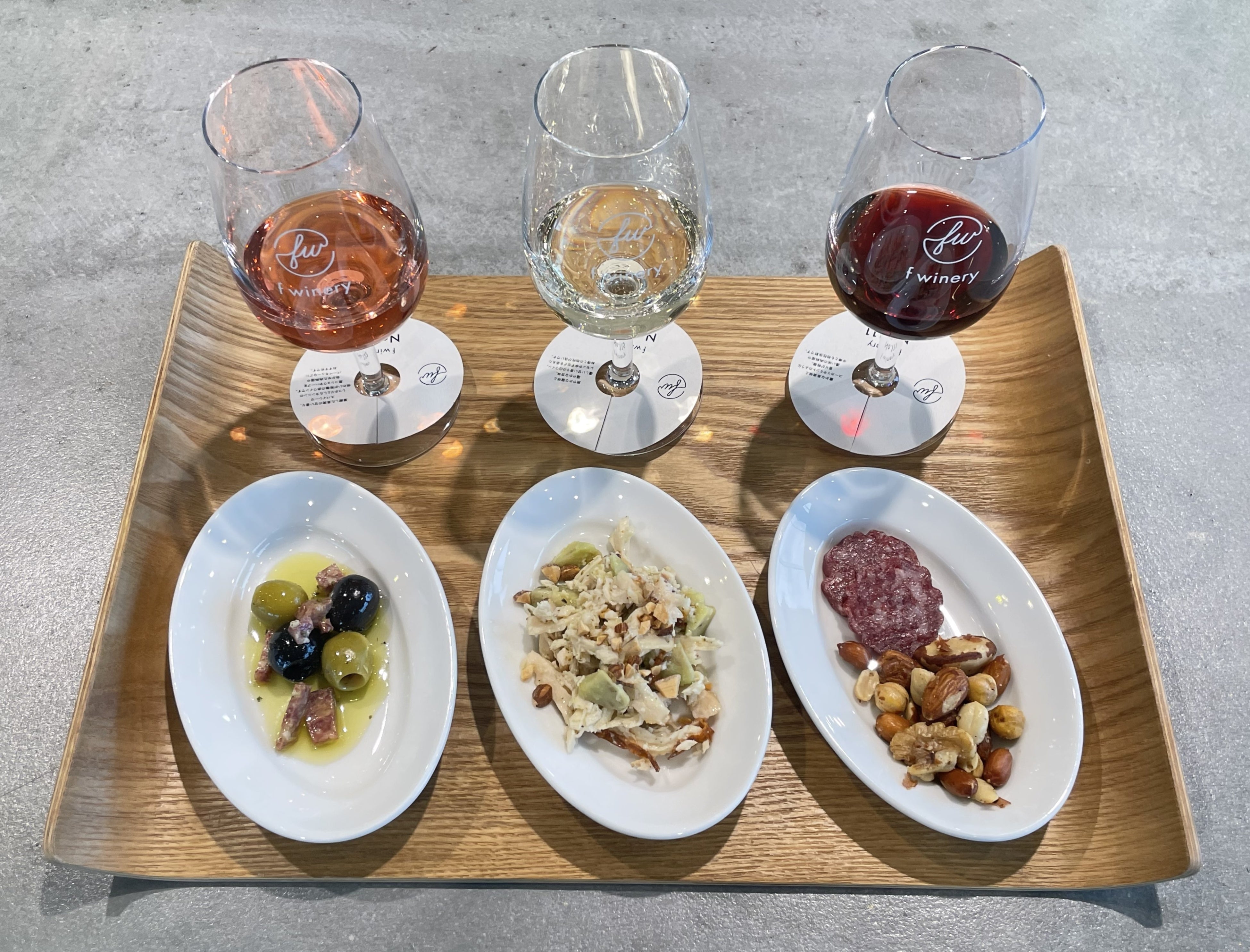 f wineryの店舗・スタンド(カフェ&バー)エリアで初提供する「樽出しf wineryNo.133神戸産メルロー〈ロゼ〉」と、「〈f wineryNo.117〉オーストラリア産コロンバール・白ワイン」、「〈f wineryNo.109〉オーストラリア産シラーズ・赤ワイン」を飲み比べることができます。※No.117とNo.109はボトル詰めワインです。