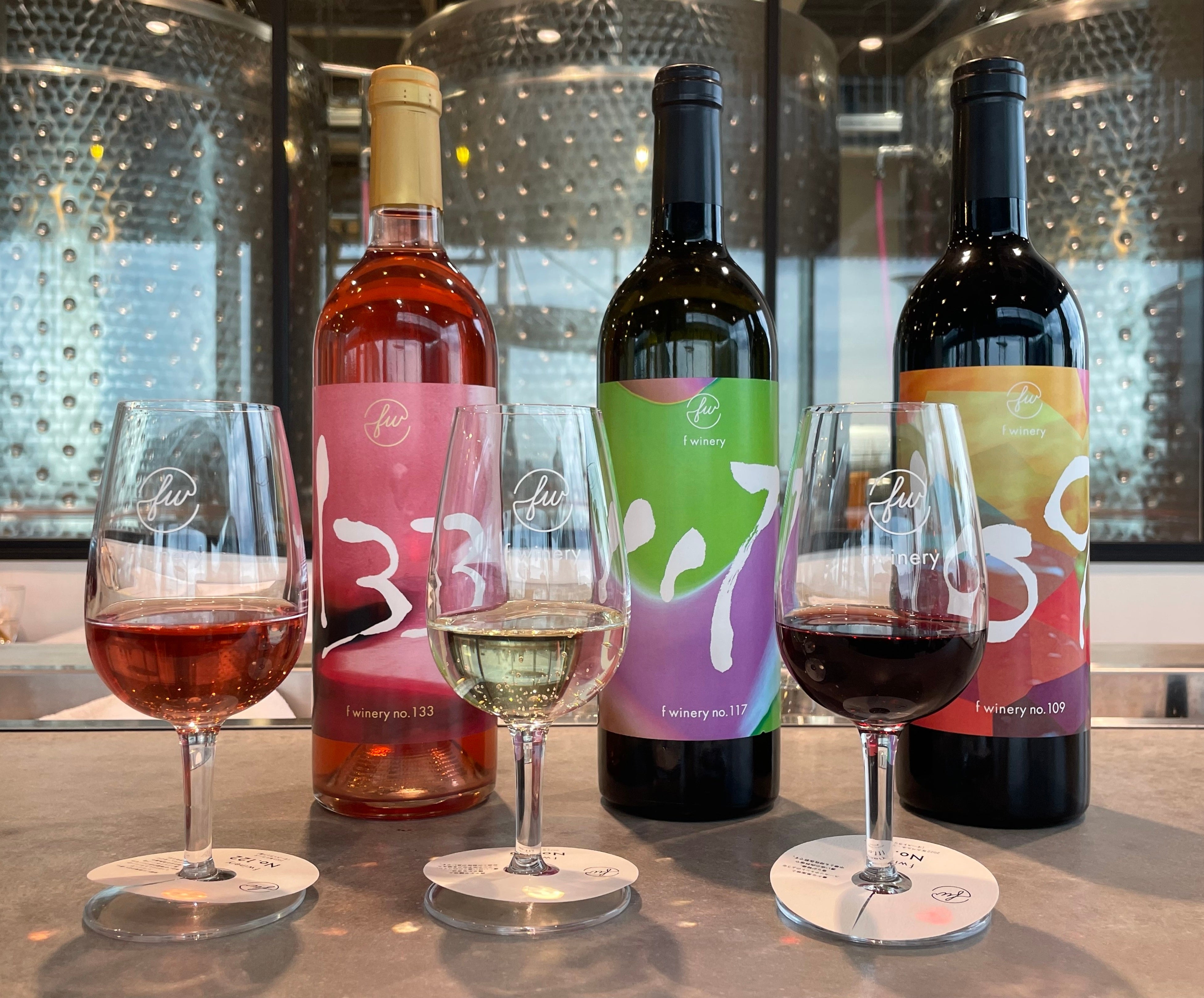 画像: 3種類のワインのイメージ ※No.133は新「試飲セット」メニューでは、f wineryスタンドに来店しないと味わうことができない「樽出し」ワインです。併せて“推しワイン”として気に入ったら購入でいるボトルワインの販売も店頭で開始します。