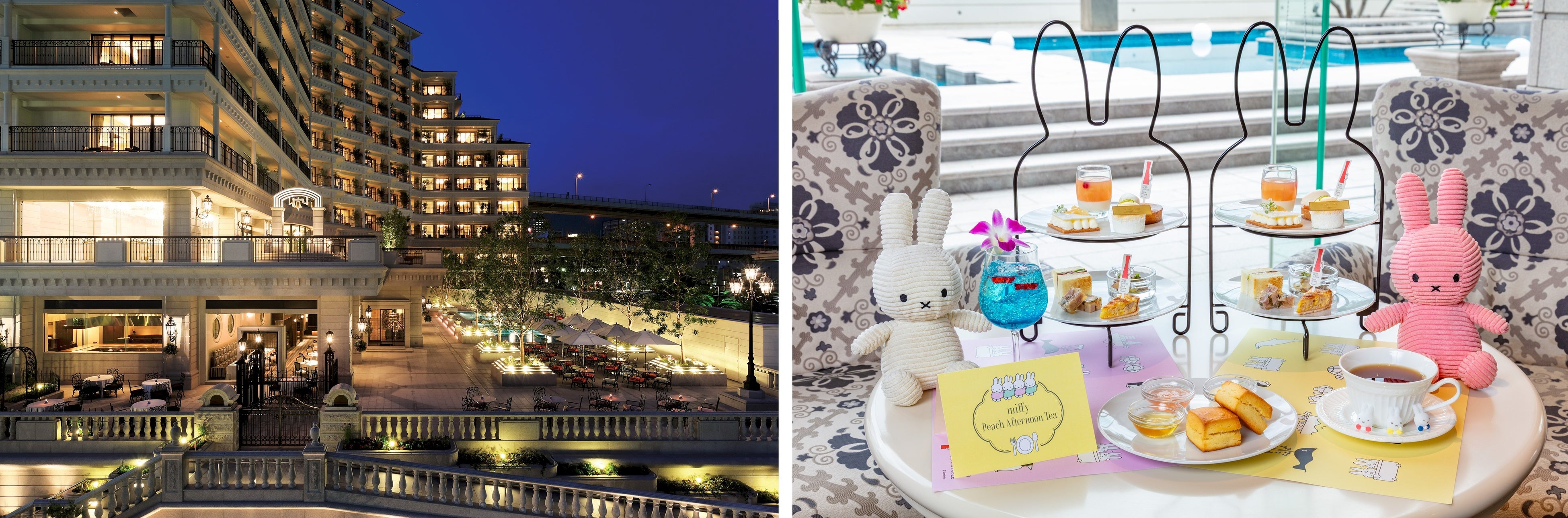 ラウンジ&バー「グラン・ブルー」にてミッフィーピーチアフタヌーンティーをご提供。また同内容のアフタヌーンティーを客室でお愉しみいただける宿泊プランも用意しています。コラボ商品ご利用者にはここでしか手に入らない限定ステッカーをプレゼントします。案内WEBサイト>> https://www.l-s.jp/