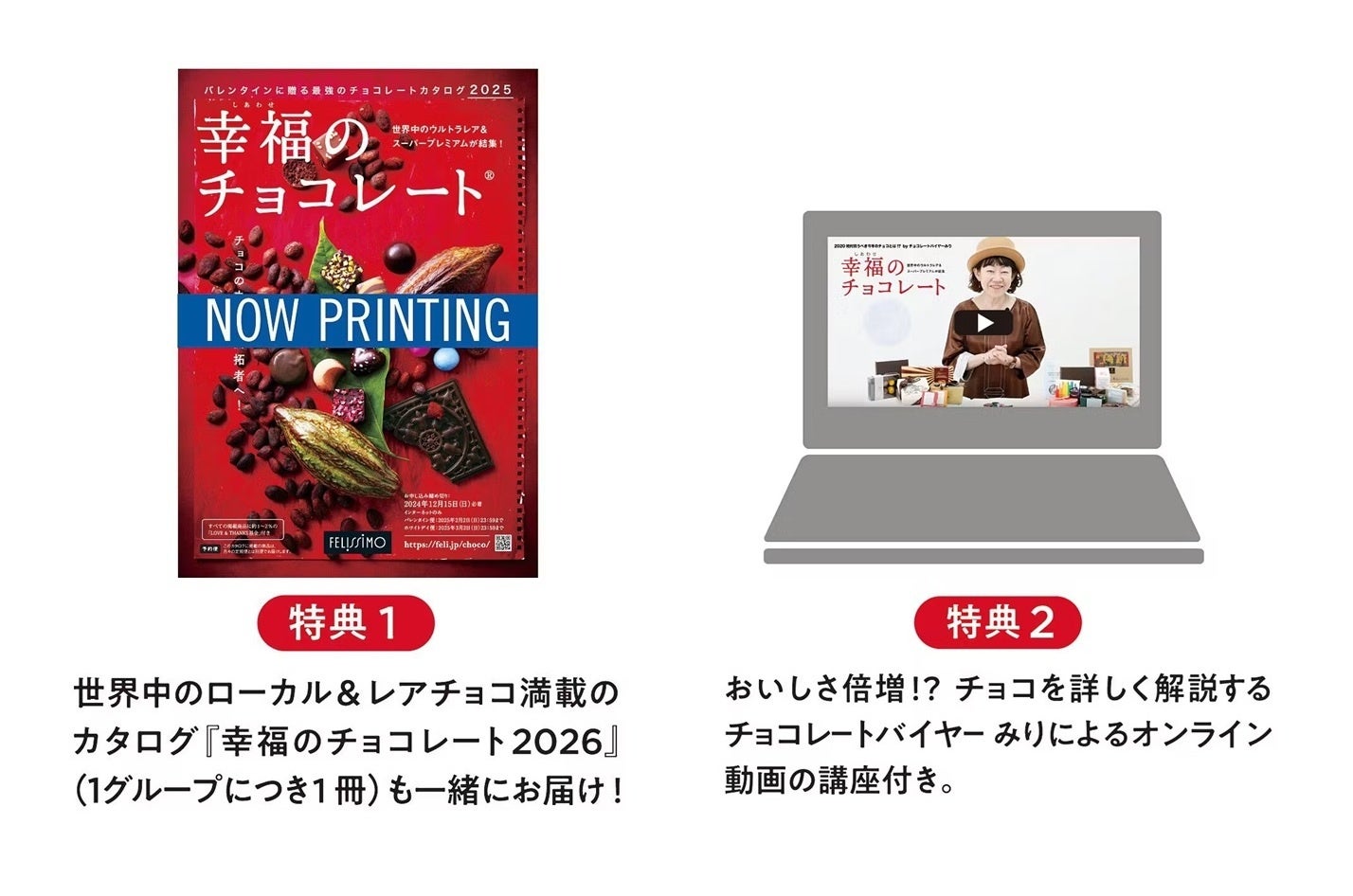 いずれのコースも、購入者特典として「幸福(しあわせ)のチョコレート(R)」の2026年版最新カタログが届き、チョコレートバイヤーみりによるオンライン動画講座を視聴できます。自宅にいながら、セミナーさながらにチョコをじっくり楽しむことができます。