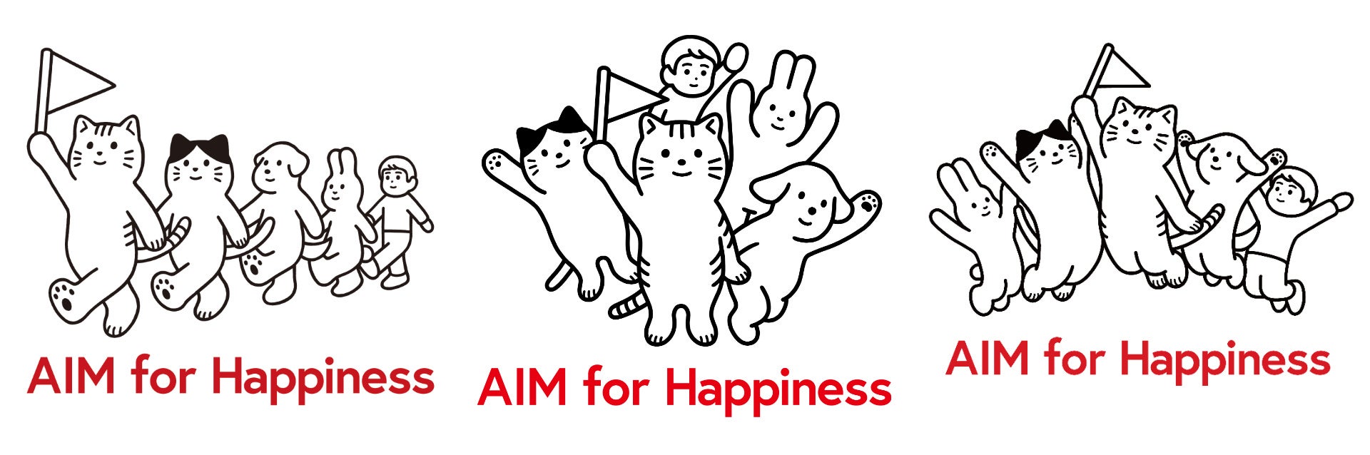 「AIMタンパク質」の「AIM(エーアイエム)」を、英語で「ねらう」や「目指す」などを意味する「AIM(エイム)」になぞらえ、「みんなでしあわせな未来を目指そう」という思いを込めたスローガンです。