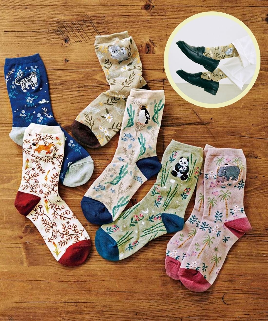 絶滅危惧動物たちが、細かい刺しゅうで表現されているアートなデザインのソックスです。それぞれの動物たちをイメージした植物柄もポイントです。足もとを華やかにしてくれる洗練された色遣いが、コーデのアクセントになります。ロングスカートやロールアップしたパンツのすそからチラッとのぞかせるのもおすすめです。