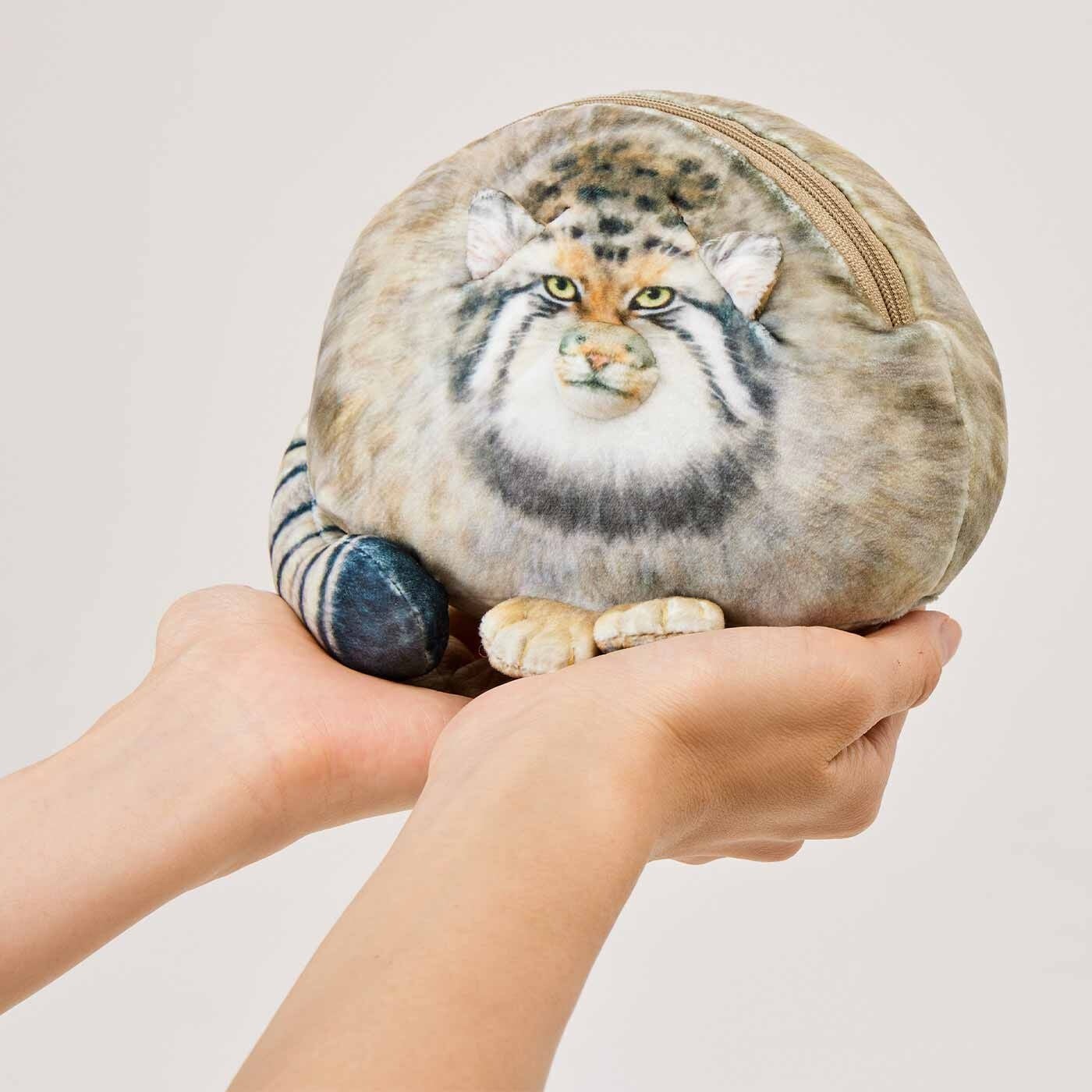 世界最古の猫といわれるマヌルネコを手軽に持ち運べる手のひらサイズのポーチ。まんまるな姿、もふもふのしっぽなどの愛くるしい特徴を細部までリアルなイラストで再現しています。