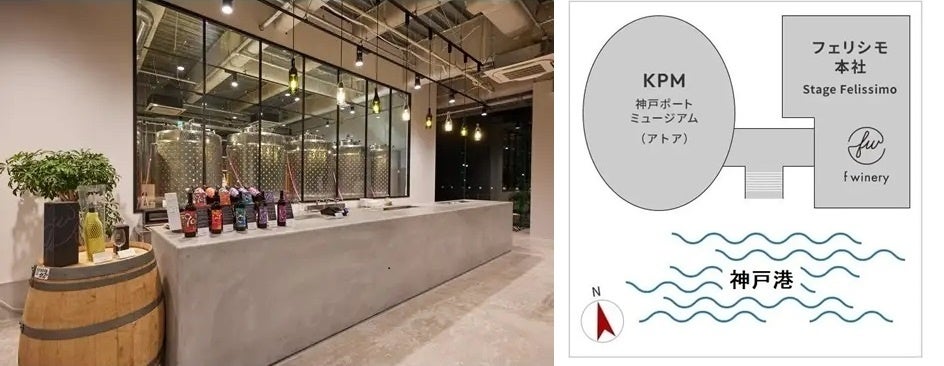 神戸市新港町ウォーターフロント地区のフェリシモ新社屋「Stage Felissimo」内に設立した都市型小規模ワイナリーです。2021年6月17日に神戸税務署より果実酒製造免許を取得しワイン醸造を開始、同11月19日より「スタンド」エリアの営業をオープンしました。これまでワインの輸入や通信販売を行ってきたフェリシモが自社でのワイン製造を初めて行い、様々な産地からその時々の良いぶどうを仕入れて土地や風土、気候に制約されないワインづくりを目指すことで、ワイン事業の可能性に探求しています。醸造家が常駐する「醸造区」では、スロベニア製のステンレスタンク7器と樹脂タンク2槽の計9つのタンクで、750mlフルボトルに換算し最大年間約3万本の製造が可能です。ガラス張りで醸造区を見ることができるスタンドエリア・カフェ&バーでは、試飲やオードブルと一緒にワインが楽しめます。また、ノンアルコールやカフェメニューも提供しています。ワインの新しい文化を発信し、ワイン造りを一緒に研究することで、ワインを楽しむ個人や企業の「年間パートナー」も募っています。