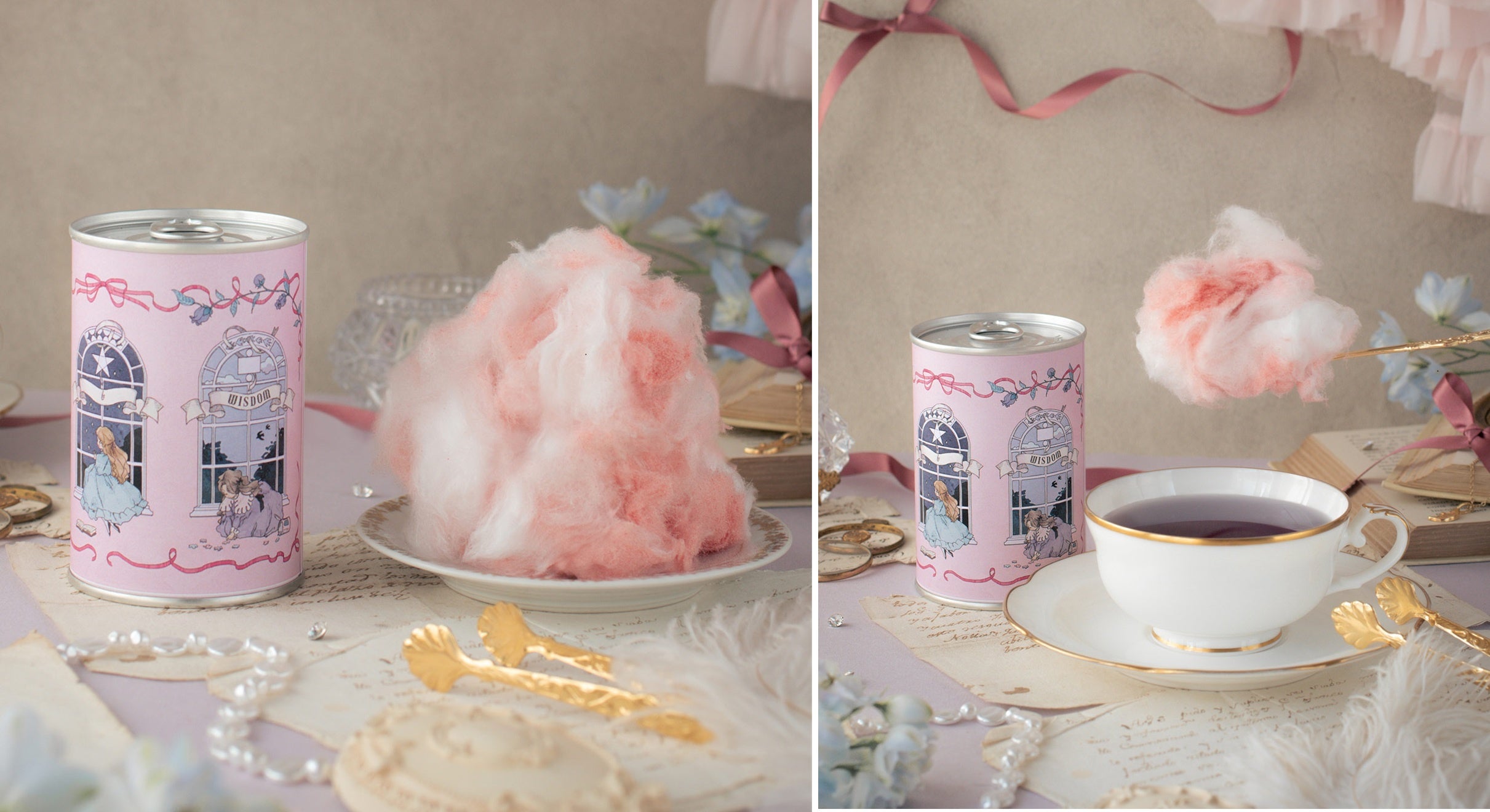 空想をテーマにした謎解きイラスト缶の中には、甘くてふわふわ、まるで夢を見ているようなコットンキャンディ(綿菓子)が。きゅんと甘酸っぱいドライストロベリー風味のコットンキャンディは、そのまま食べても、紅茶などに入れてアレンジしても楽しめます。自分へのご褒美にも、謎解き好きの方へのプレゼントにもぴったり。