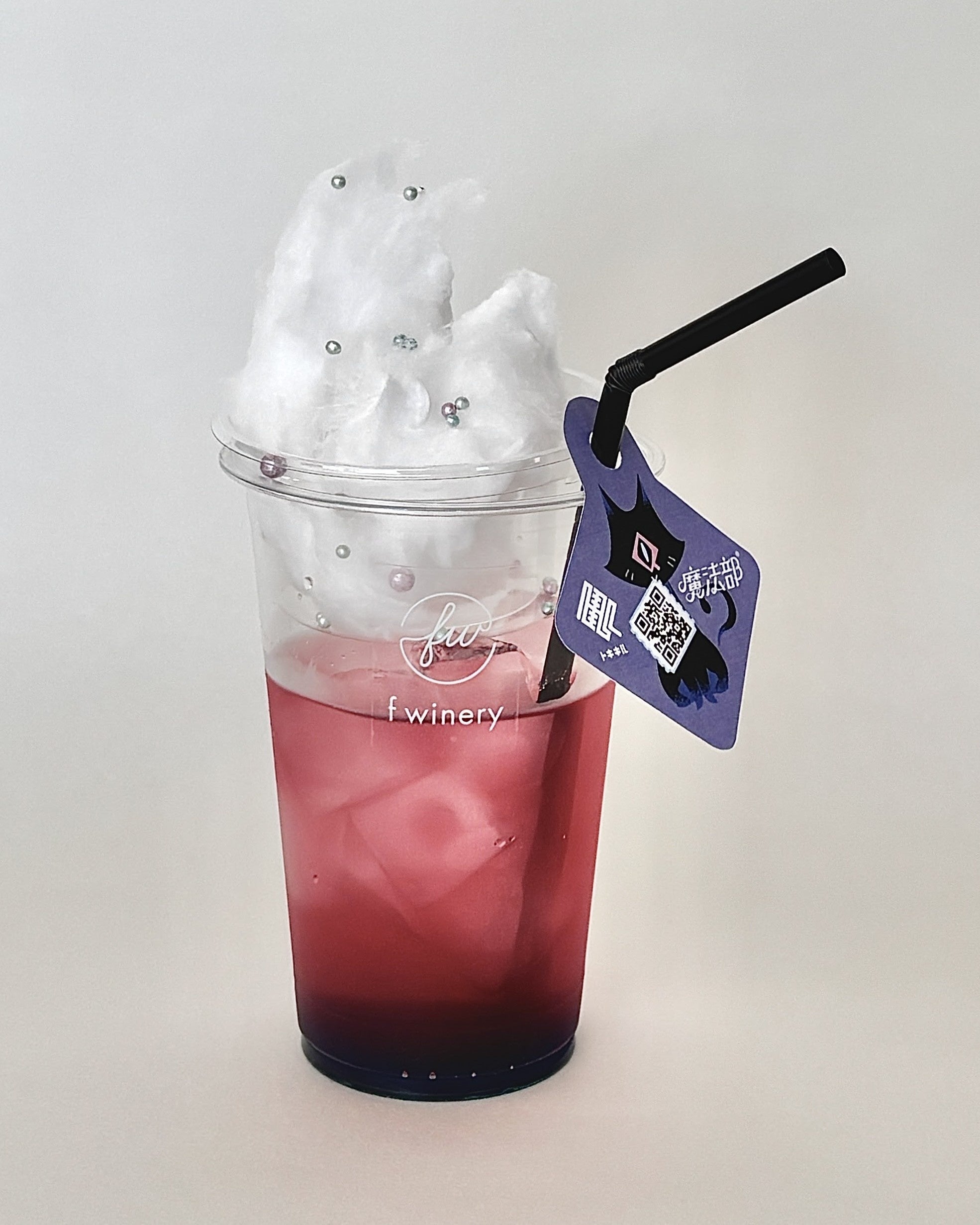コラボアイテムである「魔法部×トキキル 空想の扉を開く コットンキャンディ缶〈ストロベリーミルク味〉」をイメージしたソフトドリンク。ワインパミスティー(ワインの搾りかすを使ったハーブティー)とブルーキュラソーを使用して、紫から赤へと変わるグラデーションが可愛らしいドリンクです。トッピングされたコットンキャンディとアラザンはふわふわと幻想的で、童話のような空想の世界へといざないます。