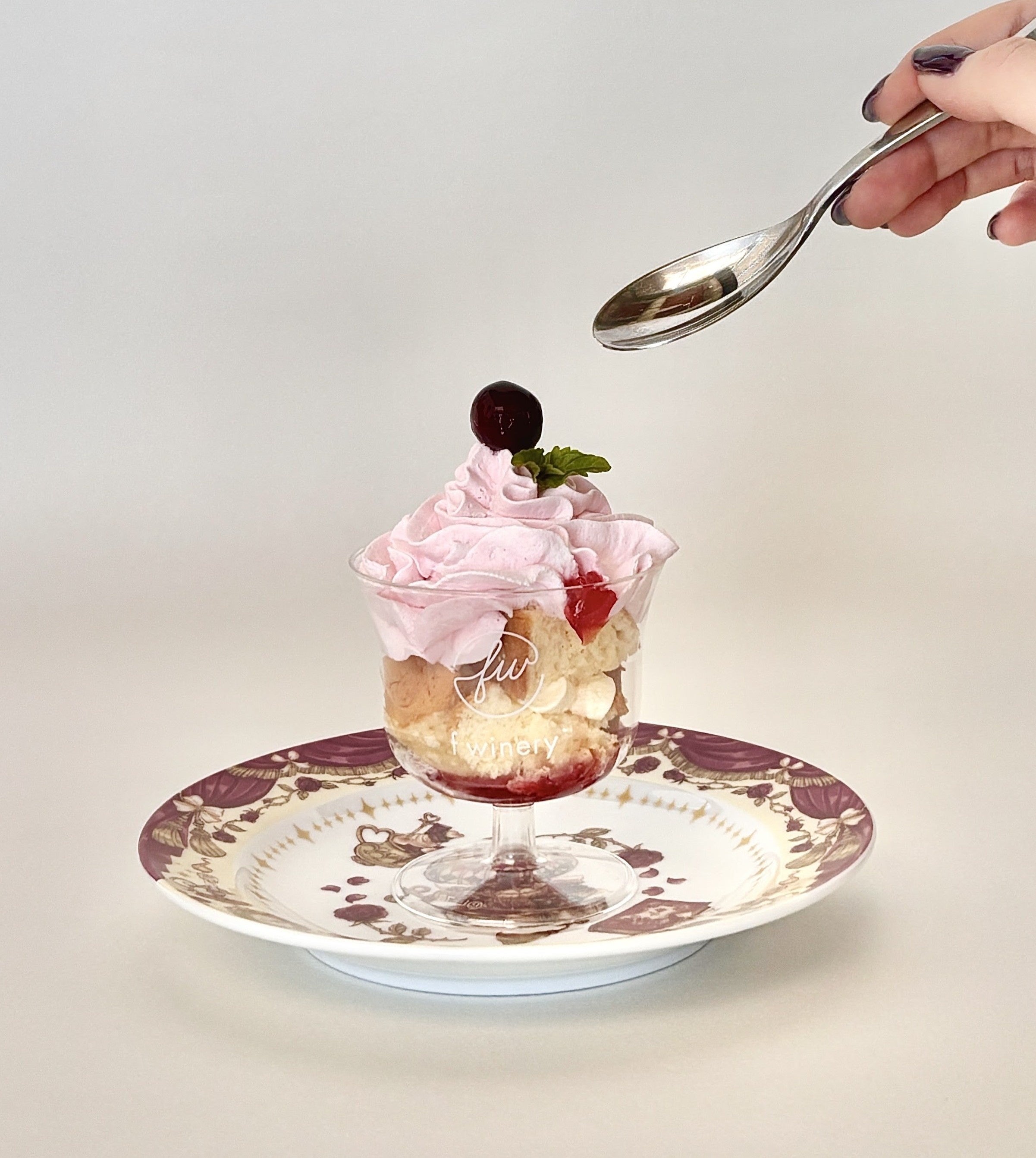 本イベントのキービジュアルをイメージしたミニパフェ。スフレパンケーキの上にはピンク色のホイップクリームとラズベリーソース。謎解きで頭を使った後の糖分補給にもぴったりです。魔法部で販売中の「魔女とお菓子のデザートプレート(3種)」のうちどれか1種に乗せて提供されます。