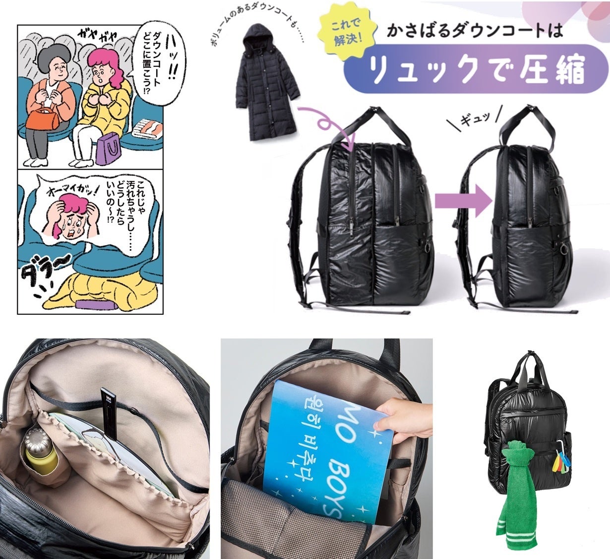 コートの置き場に困らないうえに、ライブ用のうちわもしっかり入る冬の推し活の万能リュック。2室構造でコートを入れる部分を拡張して、圧縮できるから座席の下にすっぽり収まります。背面はベルト付きでキャリーバッグに引っ掛けられます。品の良い光沢のあるブラックカラーで普段使いできるデザインです。