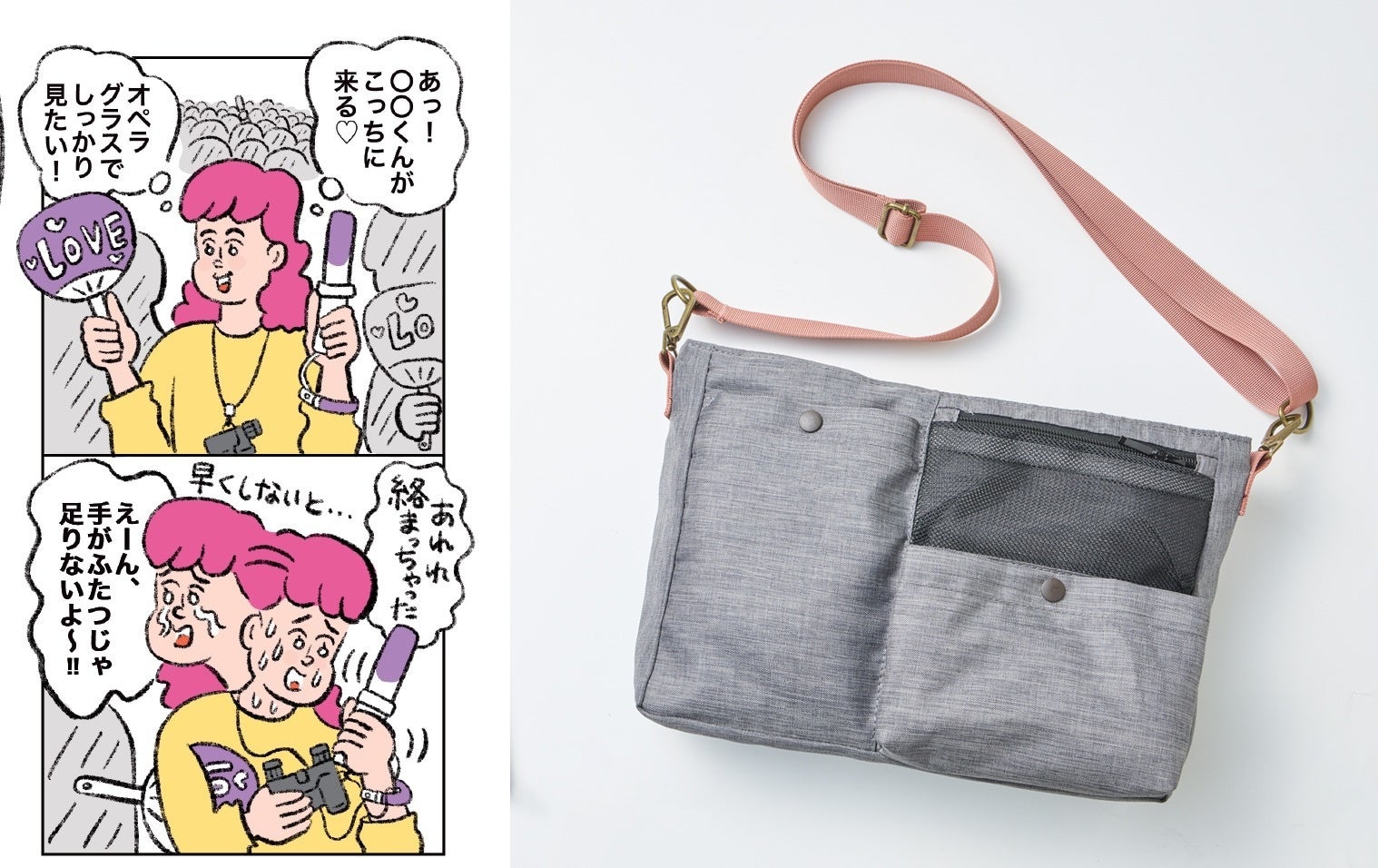 オペラグラスをずっと首からかけていたら肩がこっちゃうし、公演中に拍手をするときにペンライトが邪魔になったり、複数の応援グッズを持ち替えるときも若い人たちと違ってなんだかもたついちゃう。しかも応援グッズ以外にも替え電池に目薬にのどあめなど大人世代だからこその必需品たちがライブ中の暗闇では迷子になりがち……。
