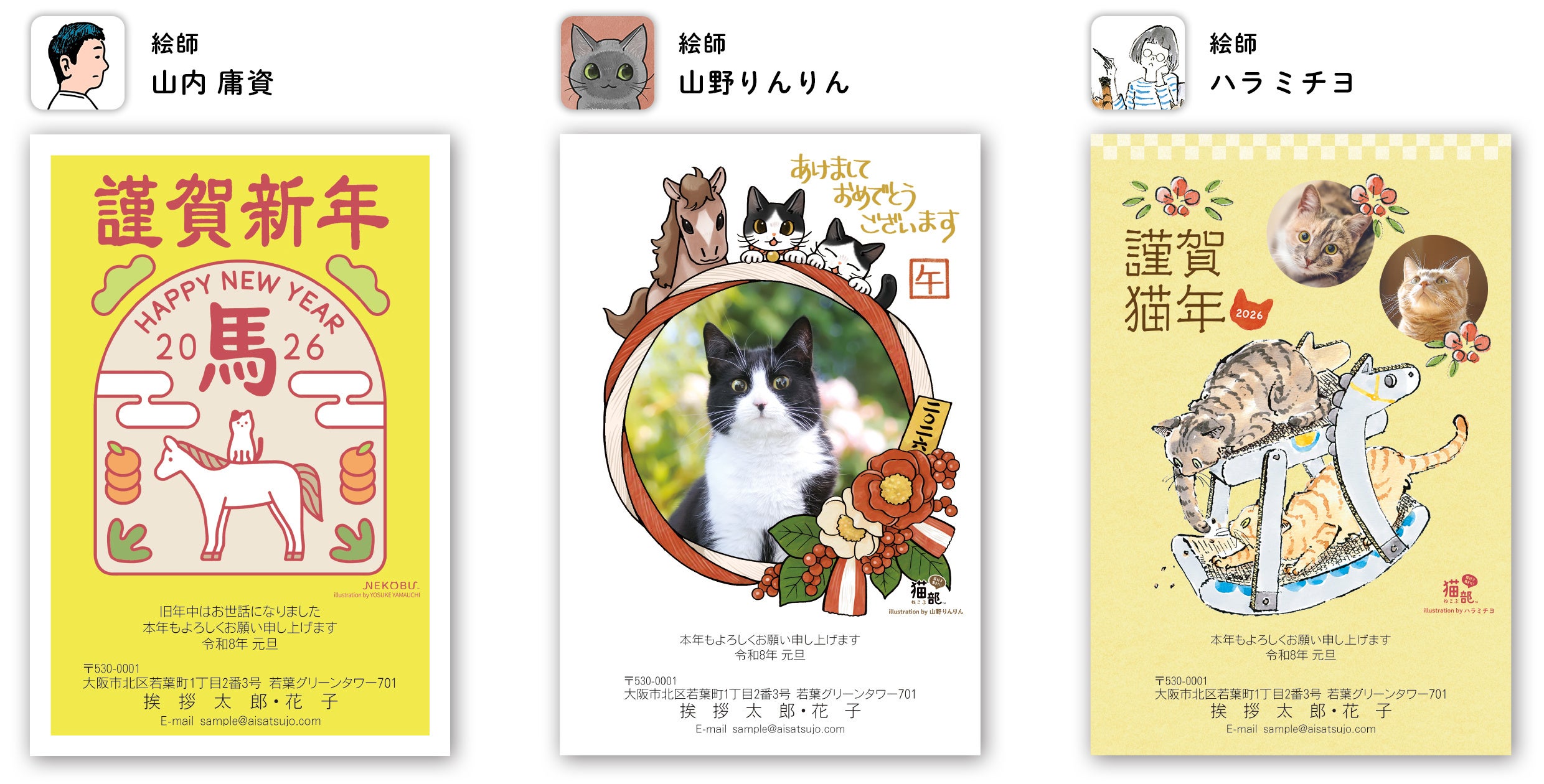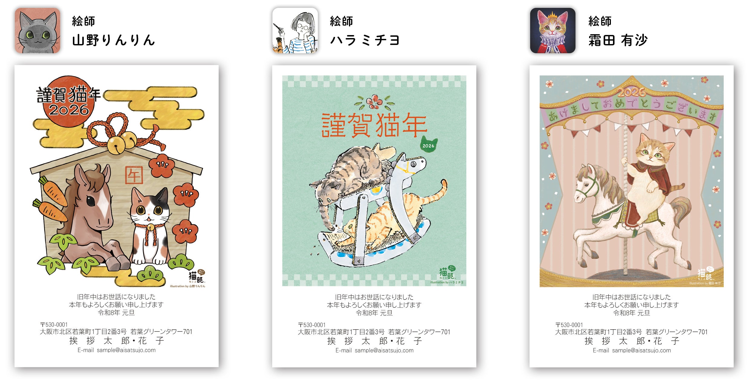 2026年のにゃん賀状には、猫部でコラボグッズが人気の作家4名が参加。2026年の干支である馬と猫があしらわれたオリジナルデザインです。