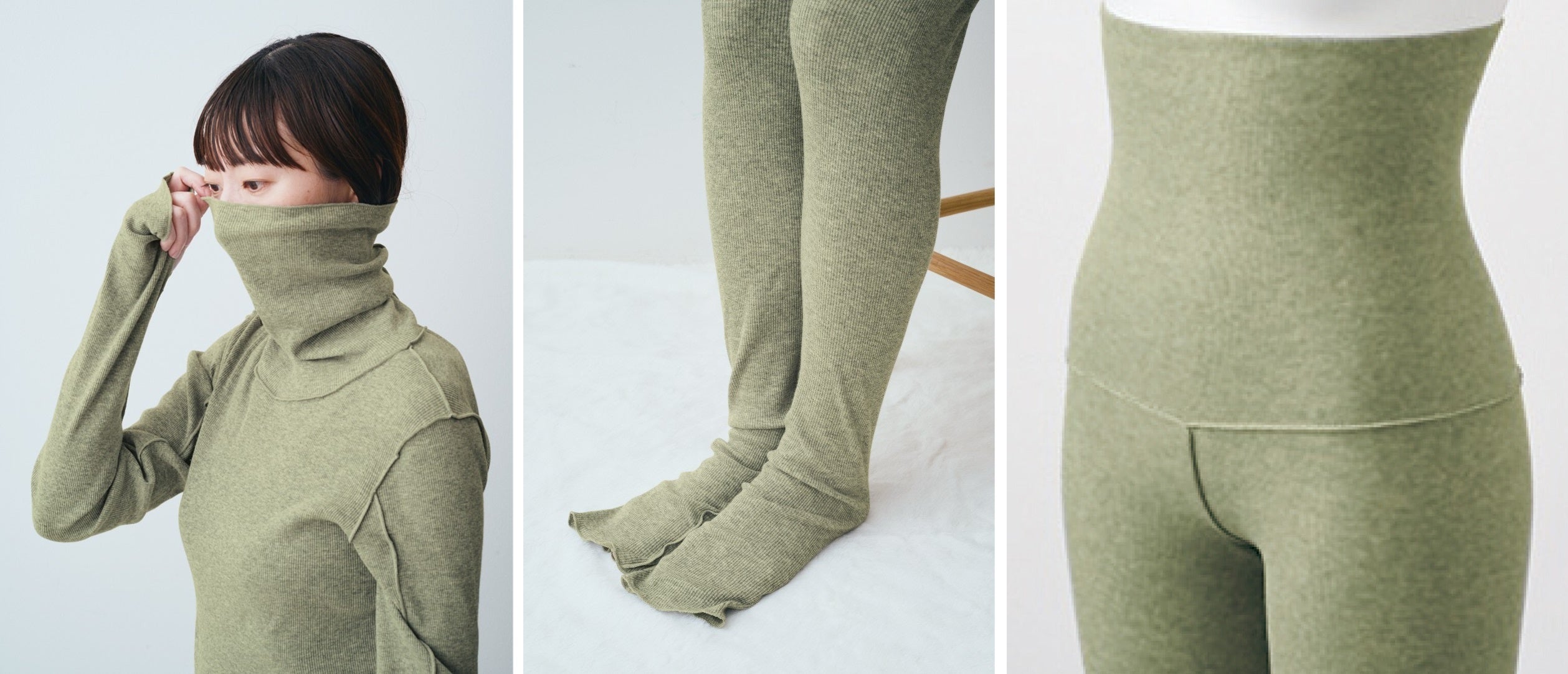 タートルネックは鼻先まで伸ばせて冷えを防止。親指ホール付き袖で手先まであたたかく、スマホ操作も可能です。袖丈と股下丈は12分丈で手首足首をしっかりカバー。さらにウエストは二重仕立ての腹巻仕様で、冷えやすいおなかをあたたかく包み込みます。(Sサイズで袖丈72cm 股下丈92cm)