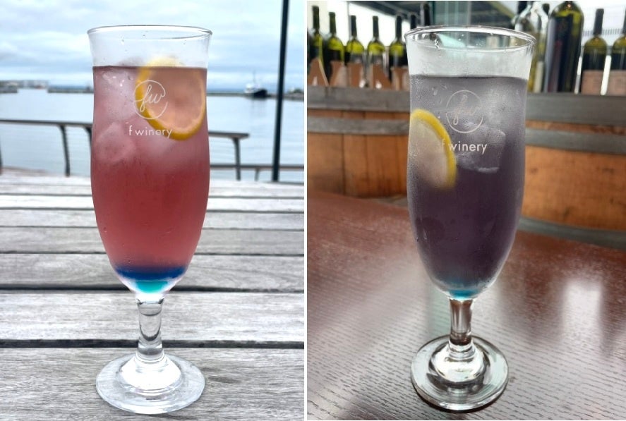 ・紫は、ワイナリーらしくワインパミスティー(ワインを造る時にでる搾りかすを使ったハーブティー)と白ワインがさっぱりとした、まるで魔法のように色が変わるワイナリーらしいカクテルです。