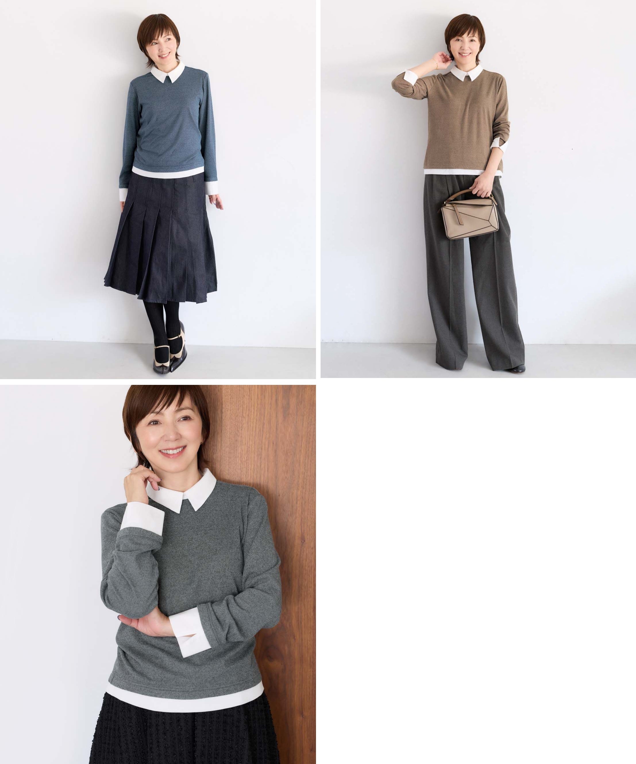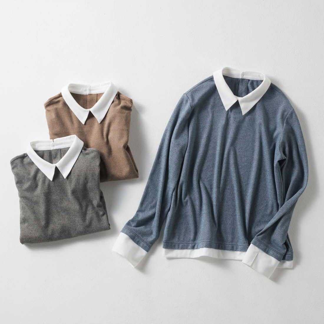 シャツ+トップスの重ね着は素敵だけれど、窮屈だったり着ぶくれが気になったり。そんなお悩みを一枚で解決してくれる異素材トップス。伸びやかで肌あたりのよいカットソー素材を使用し、あこがれの白衿レイヤードスタイルも気軽に楽しめます。