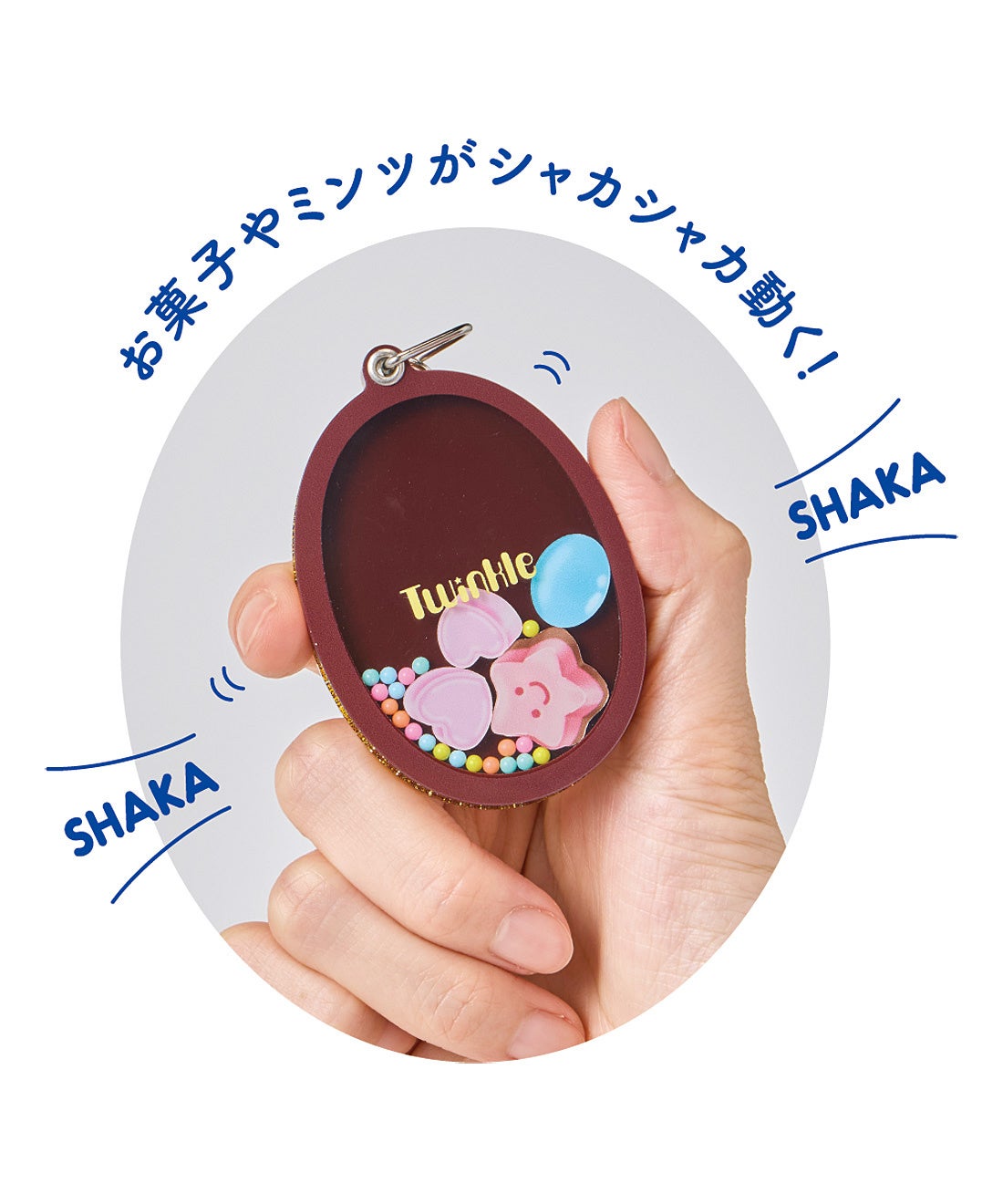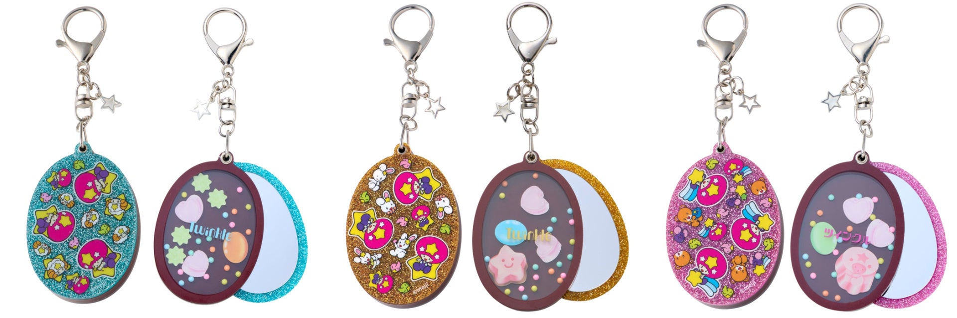 振るとツインクルの中に入っているお菓子モチーフがシャカシャカと動くアクリルキーホルダーです。スライドすると中はミラーになっていて、さっと身だしなみチェックもできます。裏面のラメカラーにイラストがプリントされたデザインは、おなじみのツインクルの銀紙をイメージ。小さなかわいい星形のチャーム付きです。いつものバッグやポーチをツインクルで飾ることができます。