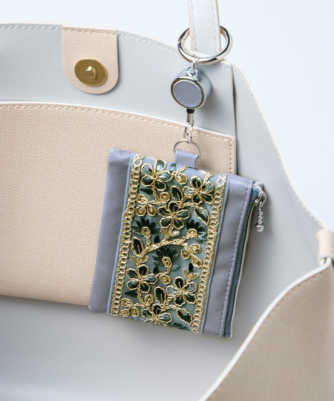 ◆お守りをしのばせる インド刺しゅうリボンのリール付きキーポーチ