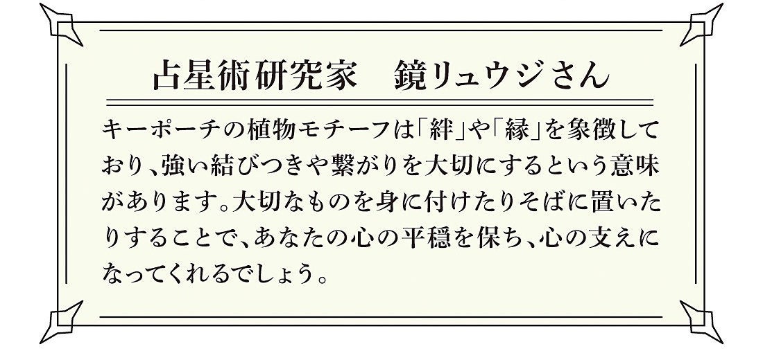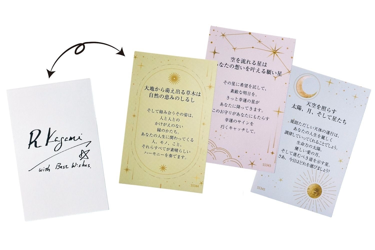 今回のコラボ企画では、すべての商品に鏡リュウジさんのメッセージカードの付属が実現。各商品にまつわる心に響くことばを鏡さんが書き起こしてくださり、サインもプリントして素敵なカードに仕上がりました。お守り代わりにお財布などに入れて持ち歩き、鏡さんのパワーを後押しにハッピーを呼び寄せてほしいという願いを込めています。