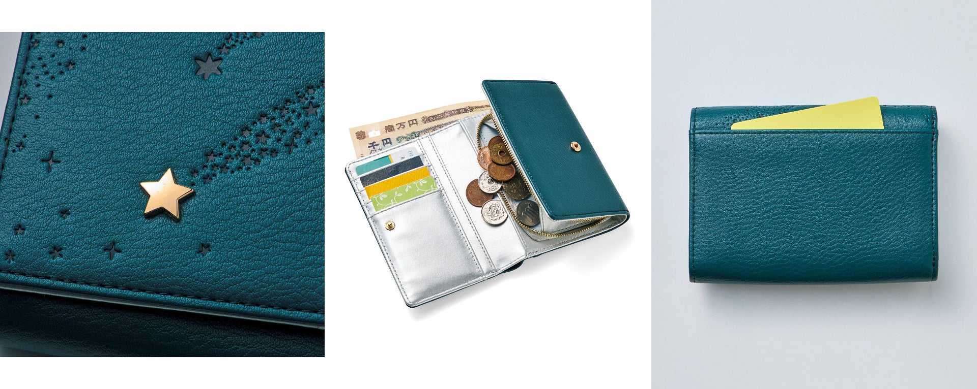 ブルーグリーンの合皮に流れ星が型押しされた大人っぽいデザインの内側は、縁起のよいシルバー色で華やかに。小銭入れはファスナーでコの字型に開閉して見やすく、背面ポケットの中にはICカードなどを入れると便利な内ポケット付き。