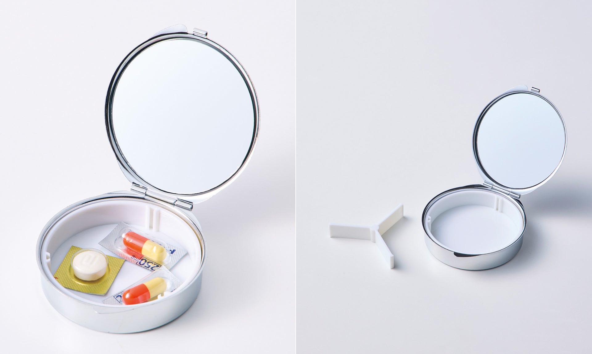 ふたを開けると、便利なミラー付き。取り外し可能な仕切りも付いて、アクセサリーのほか、常備薬やサプリメントなどもすっきり携帯できます。