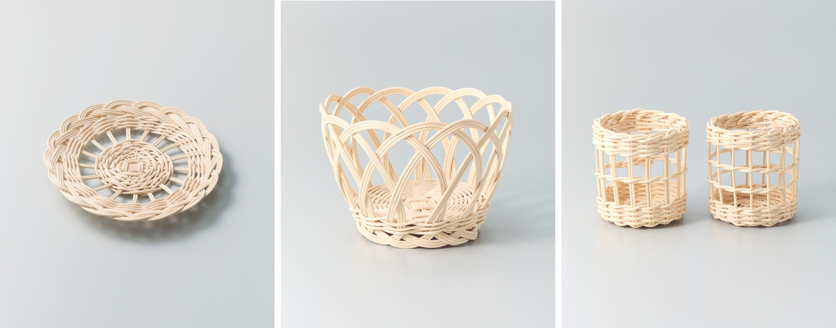 左から〈ラウンドトレイ〉〈フルーツかご〉〈グラスホルダー〉