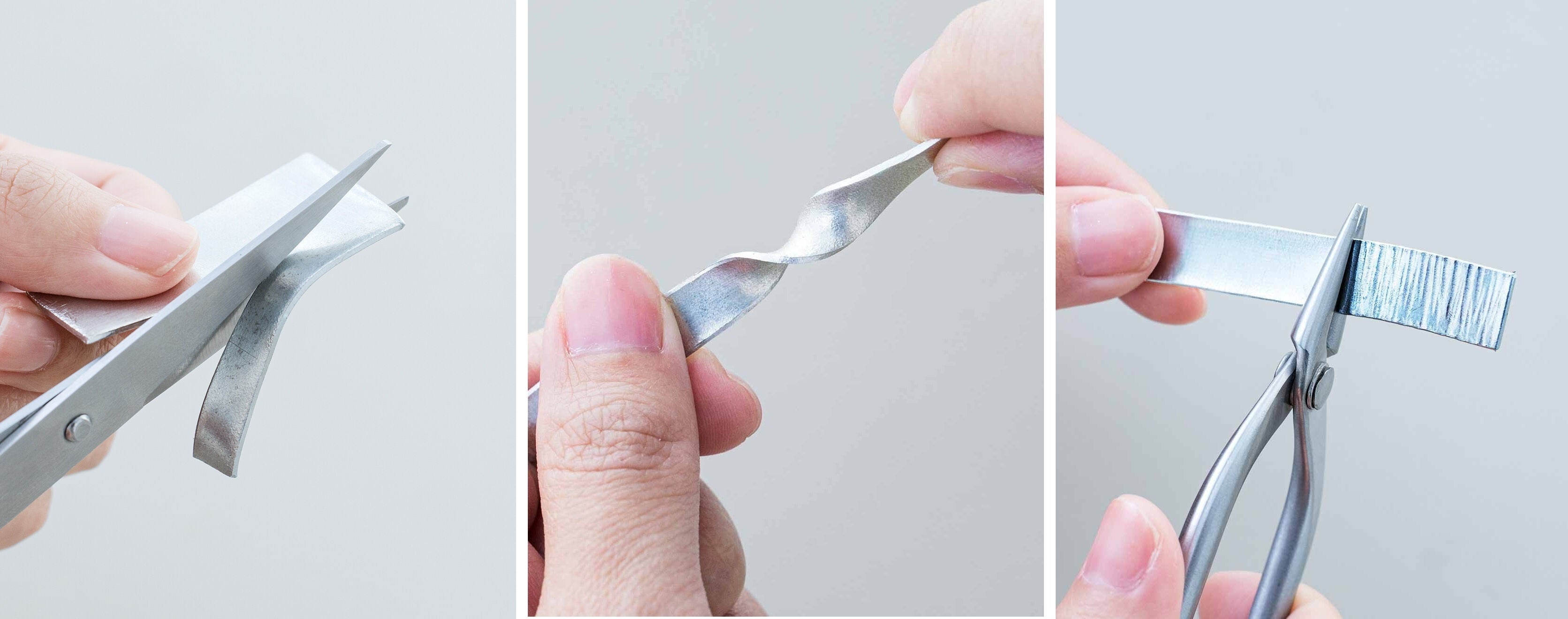 ハサミでカットできるほどのやわらかさが錫の特徴。手で曲げたりねじったり、ペンチやスプーンなどの身近な道具を使って表面に模様を付けたりも。セットの型紙どおりに作るほか、オリジナルのデザインに挑戦したり、セットの天然石や淡水パールなどを使ってアレンジしたり。自分だけの趣と上品な輝きを愉しむことができます。