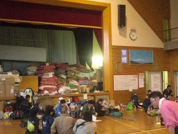 遠野まごころネットでは作業から帰ってきたあと「参加自由のボランティアミーティング」なるものが開催されます。体育館で宿泊している多くのボランティアメンバーが集まって「本日の作業で気づいたこと」「運営上、変更したい点」「実際に改善したこと」などがサンマ隊以外も含め全セクションを対象に話合われます。