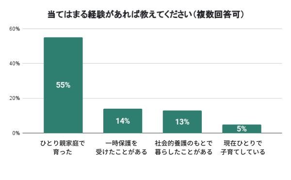 食糧支援・現金給付を希望する若年層のアンケート結果によると、51%が「ひとり暮らし」をしていて、55%が「ひとり親家庭で育った」と回答しています。