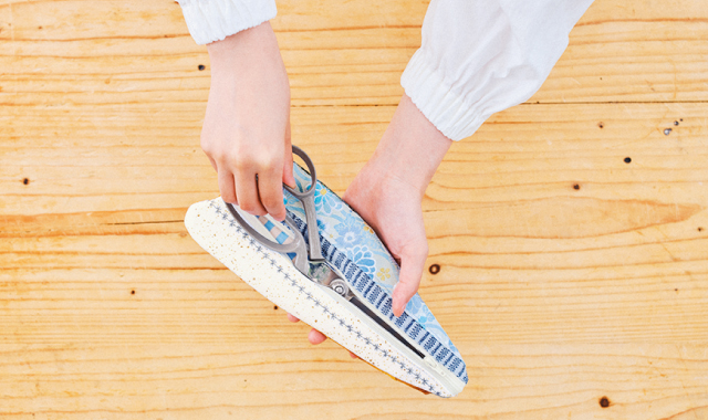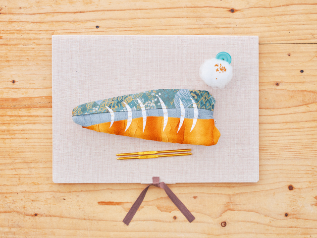 ケースは、片面を焼く前の青サバ、もう片面を焼きサバにし、おなか部分には色の異なるちりめん生地を使うことに。ただ、ちりめんはとてもやわらかいため生地が安定しづらく、裏に接着芯を貼る必要がありました。そこで、「あえて接着芯にシワをつけて貼れば、焼きサバの皮のシワっぽさが出せるんじゃないか」と、制作中にひらめきました。これは、以前から接着芯を貼るときに失敗してシワができてしまう、その 失敗を逆手に取ったアイデアです。