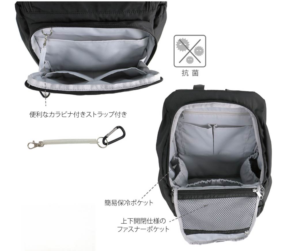 ショルダー紐にはICカードや小物を入れられるファスナーポケット。底面には汚れ物入れに便利な防水ポケット。抱っこ紐をつけたままリュックがおろせるバックル仕様。キャリーバックに通せるベルトや、長財布まで入る背面ポケットなど、年代を問わずさまざまな用途に対応できる仕様です。