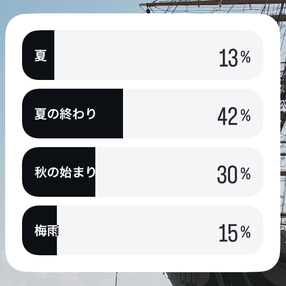 心の休暇がとれたらどこに行きたい気分か?たずねてみました。いちばん多かったのは「温泉旅館」。木曜日ということもあって、刺激よりも回復や癒やしを求める気持ちが強かったのかもしれません。ゆっくり湯に浸かって、何も考えずに過ごしたい——そんな心の声が聞こえてきます。「離島の民宿」を選んだひとは、日常から少し距離を置きたい気分。人は少なめ、時間はゆっくり、そんな静かな逃避を思い描いていたのかな。「湖畔のロッジ」は、自然のそばで落ち着きたい心境。にぎやかさよりも、静かな景色に身を置きたい感覚。「シティホテル」を選んだひとは、完全に休むより、ある程度きちんと整った環境で過ごしたい気分。疲れてはいるけれど、まだ踏ん張れている状態かもしれません。編集部は「温泉旅館」に一票。疲れがたまってきている気がして、ぬくもりと回復がいちばんの目的地でした。