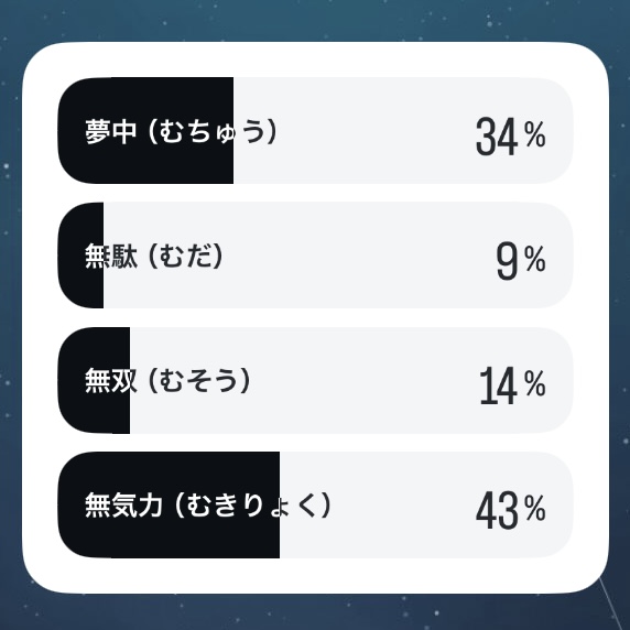 平日勤務のひとは週の最終、金曜日。漢字一文字で気分を表してもらいました。圧倒的に多かったのが「疲」。うん、そうだと思います。それだけ一週間がんばったしるしでもありますね。そんな金曜日の夜は、いっぱい自分にやさしくしてあげましょう。「焦」を選んだひとは焦燥感にかられた一日だったのかも。週末なのに仕事が片付かないとか……。そういうときは気持ちを切り替えて、あえてのんびり構えてみると落ち着けるかもしれません。「穏」を選んだひとは、心地よい気分で過ごせたのかな。この漢字はなぜか眺めているだけで心が休まる気がします。「驚」はごく少数でしたが、なにかびっくりするようなことが起きたのかもしれません。ときどき、そんな日もあります。編集部は「疲」に一票。でも、週末の予定を考えると気持ちは上を向くのでした。