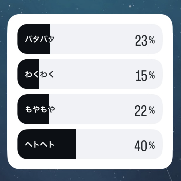 一日の感情をオノマトペで表してもらいました。いちばん多かったのは「ソワソワ」。なんだか落ち着かない、心の居心地がいまいちな一日だったのかもしれません。週のはじまり月曜日は、なぜか緊張感がありますよね。なんでだろう。次に多かったのが「モヤモヤ」。心に引っかかることがあったひとも多かったようです。週始めからすっきりしない気持ちを抱えるのは気が重たいですが、週末に向かってだんだんモヤが晴れていきますように。「ワクワク」を選んだひとは、ちょっと未来に希望が持てるできごとがあったのかな。よかったですね!「イライラ」を選んだひとは、気持ちを切り替えておおらかな心を取り戻してほしいなと思います。甘いものを食べたり、ふにゃふにゃした言葉を発したり。自分なりのストレス解消法を試してみてくださいね。編集部は「モヤモヤ」に一票。疑問を感じながらも、スルーしようともがいていました。