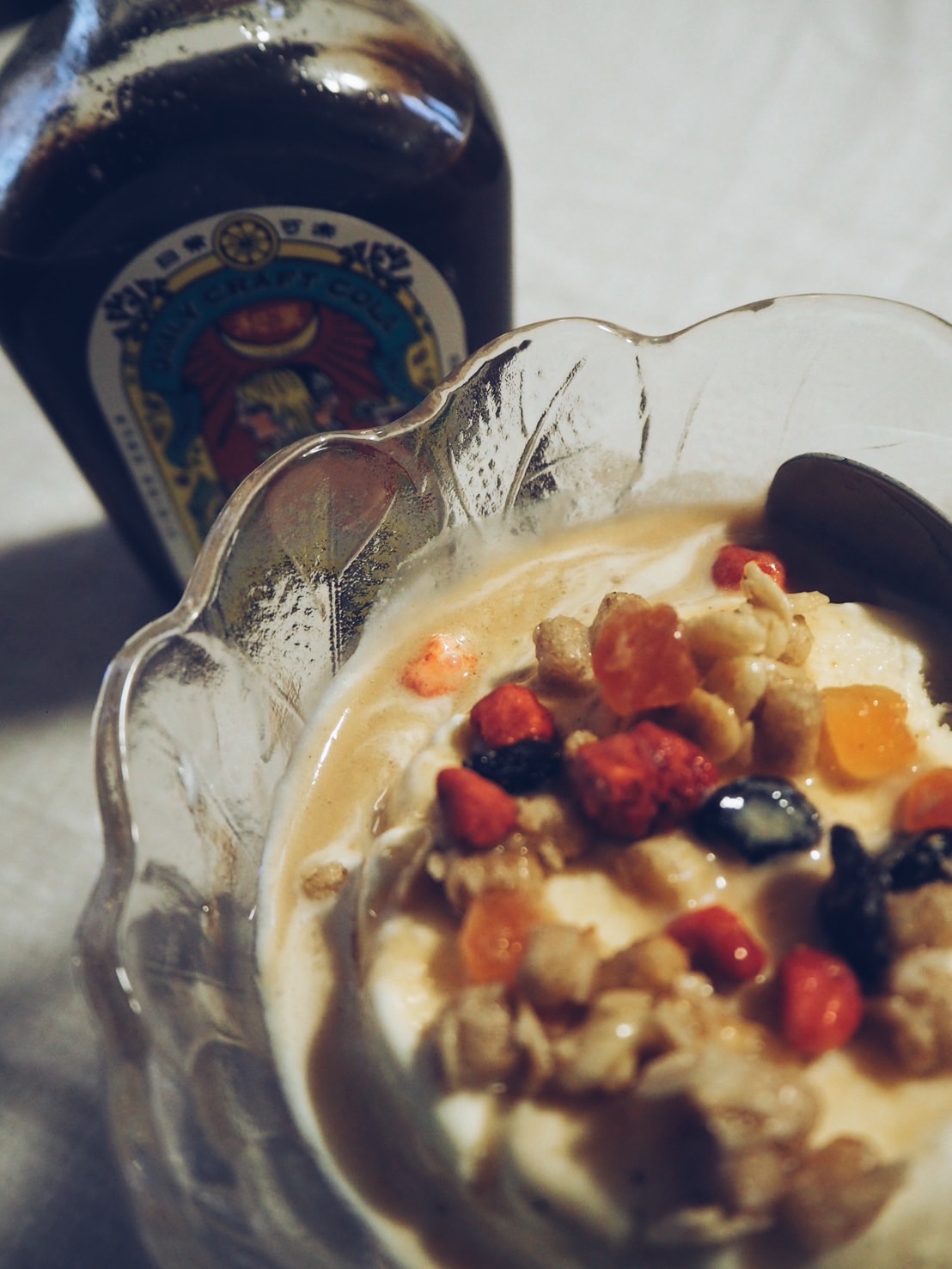 いつもならカップのまま食べるけれど、今日は大好きなグラノーラと一緒にお皿にのせよう。仕上げに、コーラシロップをたっぷりと。