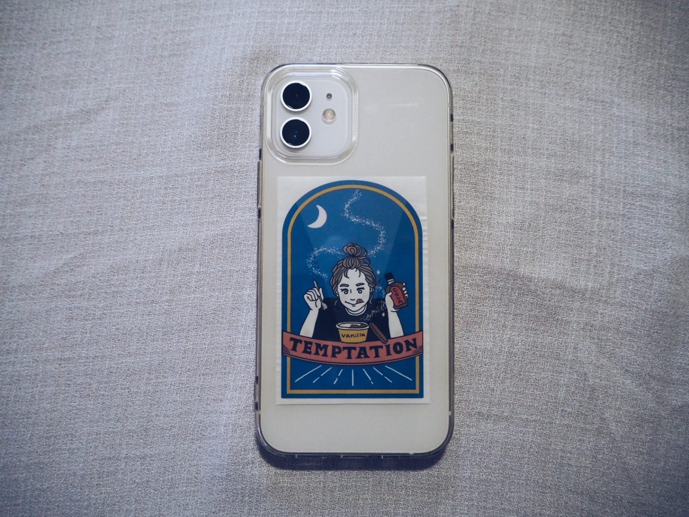 『23時の誘惑セット』に入っていたステッカーは、スマートフォンのケースに入れることにした。