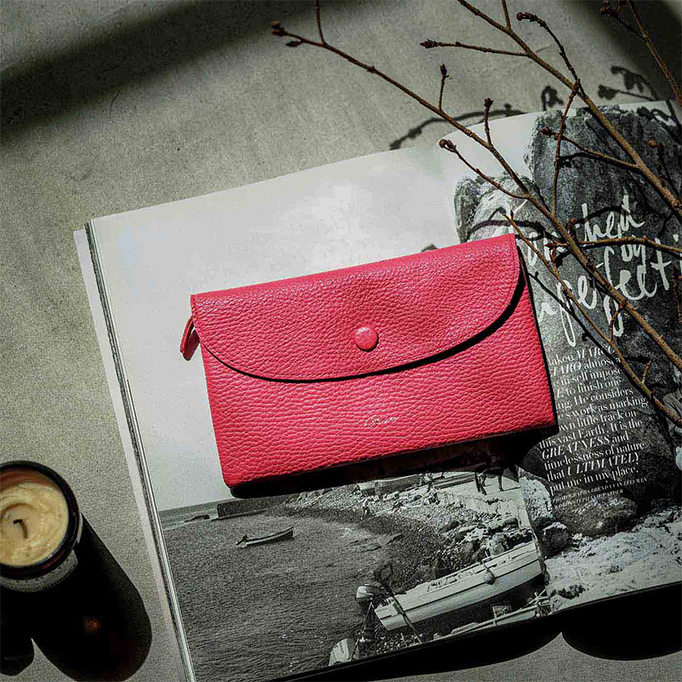 見た瞬間一目ぼれしてしまうチェリーピンク。シンプルな財布のデザインがこのカラーだと一気に華やぎます。主役級の色合いは、アクセのように、服のコーデと一緒に楽しめます。