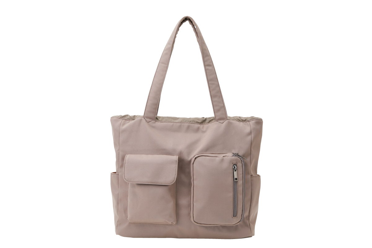 フロント外側のポケットは立体的で、外付けポーチ感覚で使える収納力です。するっと出し入れできる上部フラップタイプと、肩にかけたままで出し入れしやすいサイドファスナーの2タイプ。両サイドのポケットは傘やボトルを入れたり、Dカン付きなので、かぎやパスケースの定位置にも。