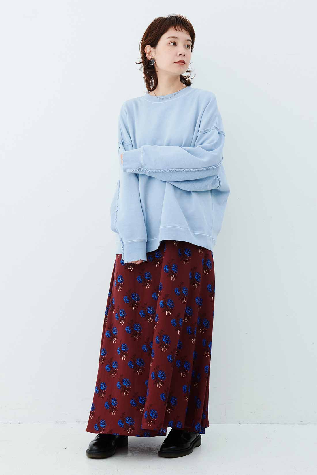 バーガンディーカラーの花柄マキシワンピースにスウェットを重ねたこなれカジュアルフェミニン