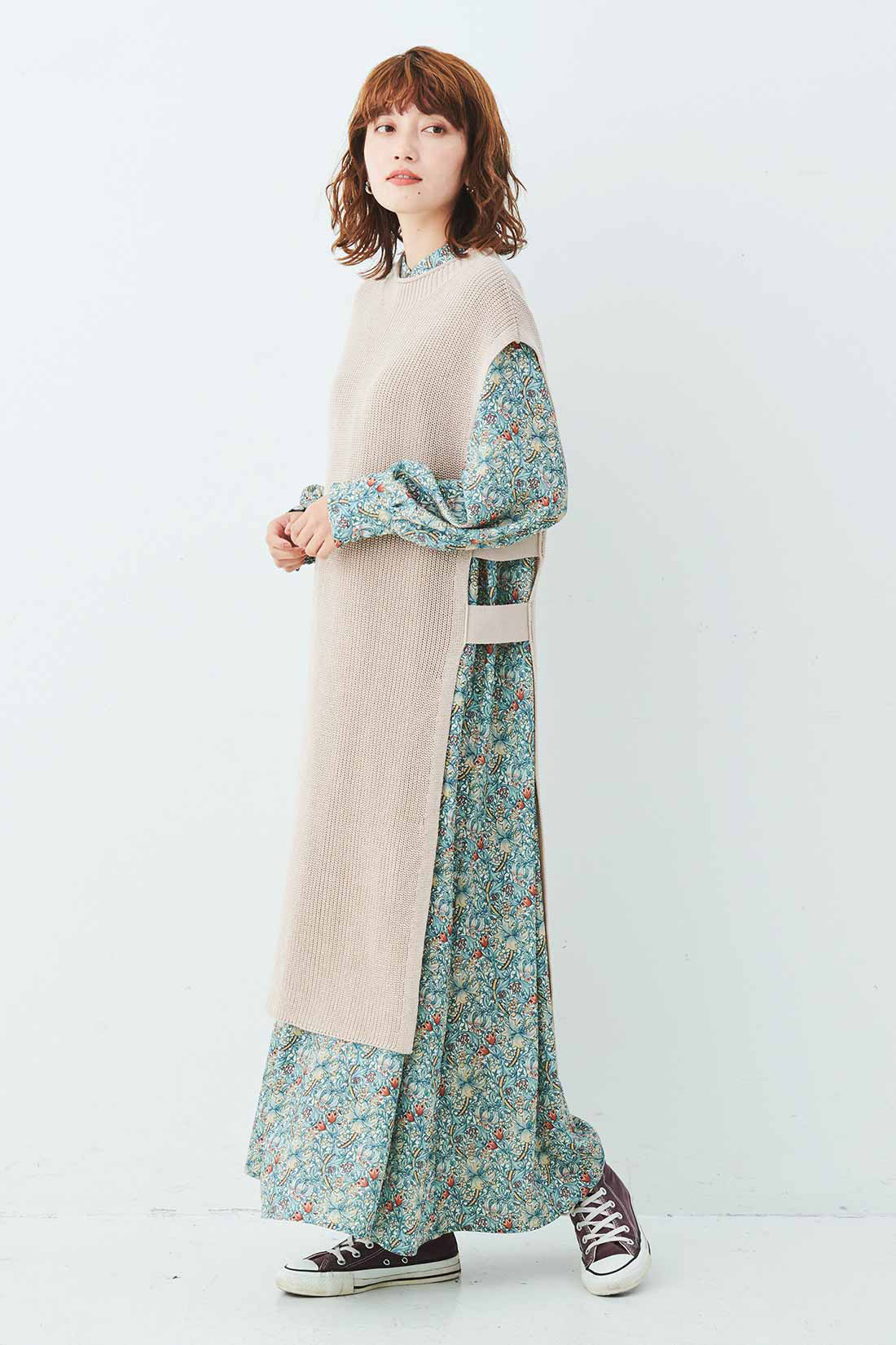 この春注目のボタニカル柄や花柄のワンピースは、マキシ丈をチョイスすることで着こなしのアレンジの幅がグッと広がります。旬のエッセンスをプラスしたいなら、秋冬から人気のベストレイヤードにチャレンジしてみてはいかがでしょう。 ベストはロング丈をチョイスしてあげると、新鮮なバランスで着こなすことができます。さらにサイド開きやサイドスリットデザインのものなら、抜け感たっぷりの着こなしに。 ダークカラーよりも淡いカラーを選び、軽やかさを演出するのがポイントです。